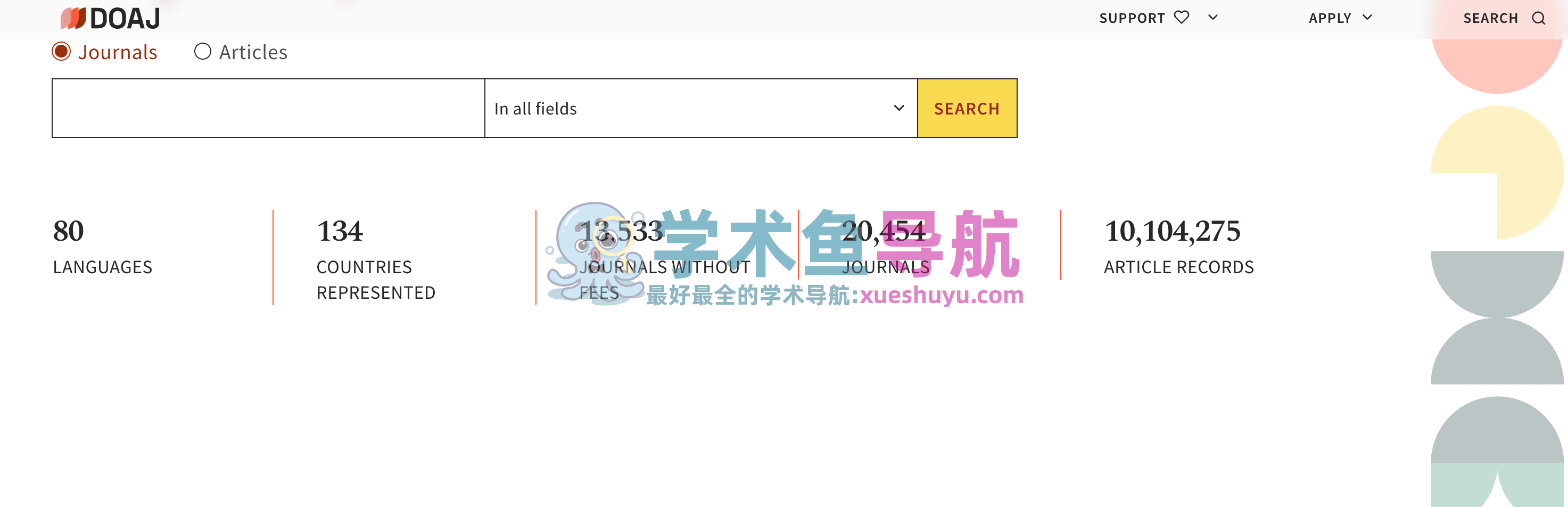 到2021年,DOAJ数据库已经收录了超过17,000种开放获取期刊,其中超过12,000种期刊不收取任何文章处理费(APC),收录的文章数量超过了680万篇,收录文献来源于130个国家/地区,覆盖了80种不同的语言,是世界上最大的开放获取期刊数据库。