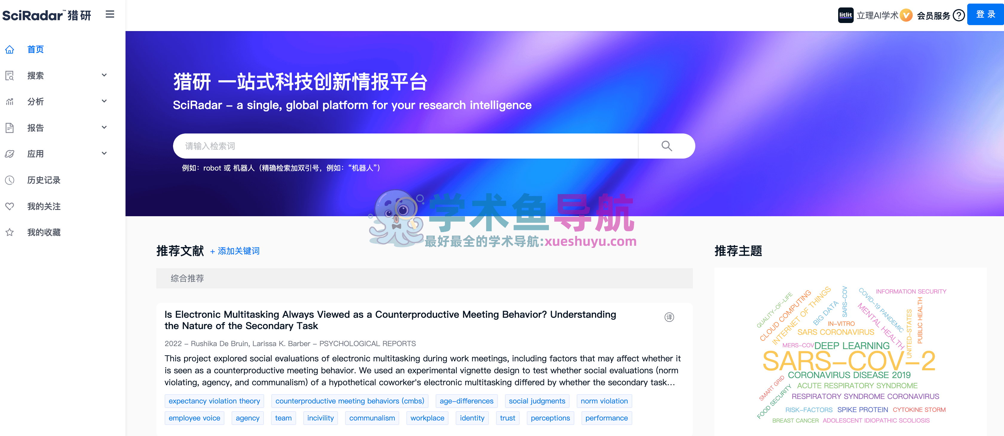 SciRadar 是一个新兴的学术搜索引擎,它提供了对全球科研文献的检索,特别是对于欧洲地区的学术资源有着深入的覆盖。