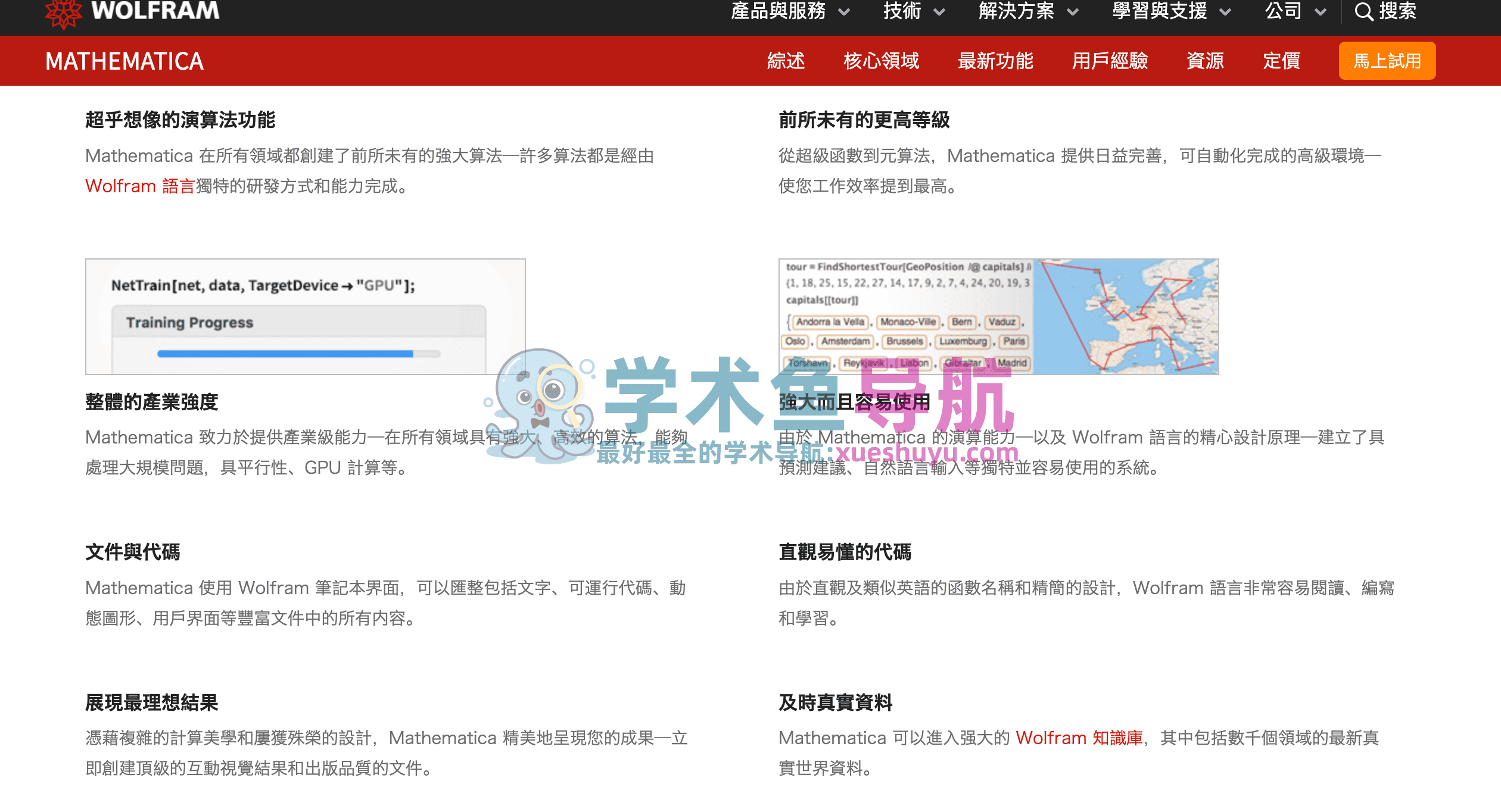 Mathematica 在其三十年的开发历程中,在技术计算领域确立了最先进的技术,并为全球技术创新人员、教育工作者、学生和其他人士提供了最主要的计算环境。Mathematica 以卓越的技术和简便的使用方法享誉全球,在此基础上,它提供了单个集成并且持续扩展的系统,涵盖了最广最深的技术计算功能,并可通过网页浏览器实现云端的完美访问,以及在所有现代桌面系统上的本地访问。