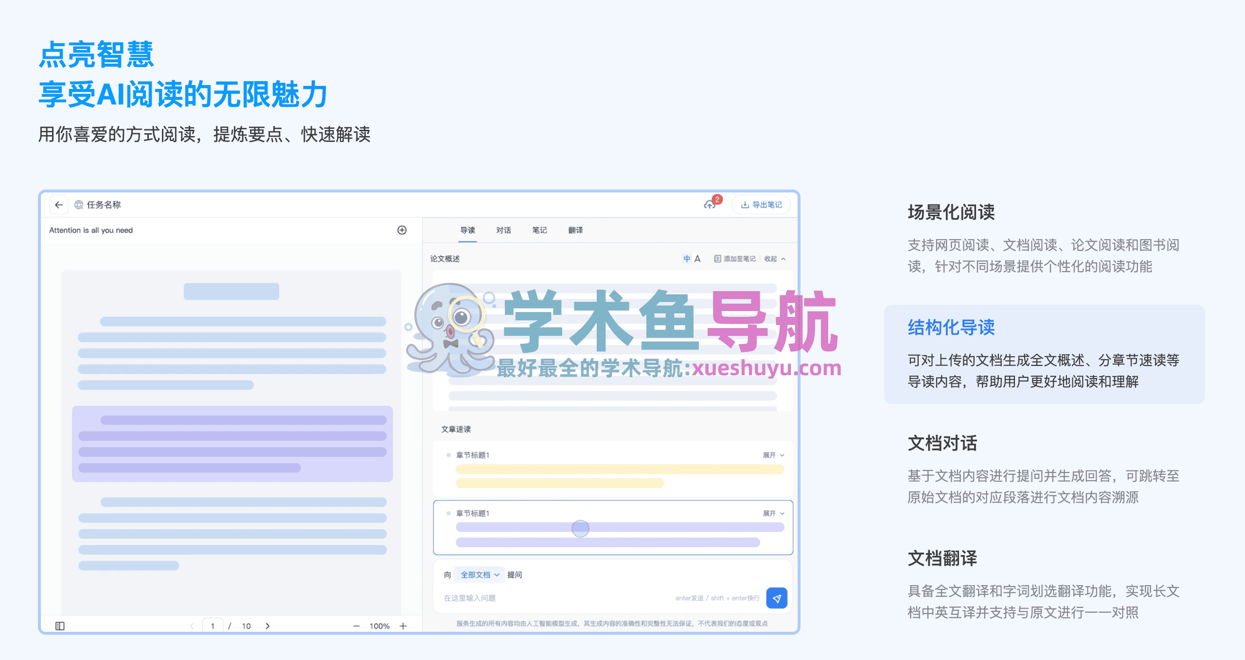 4. **自由阅读**:添加各类文档,助您分析长文档的关键内容,使阅读更加便捷高效。
