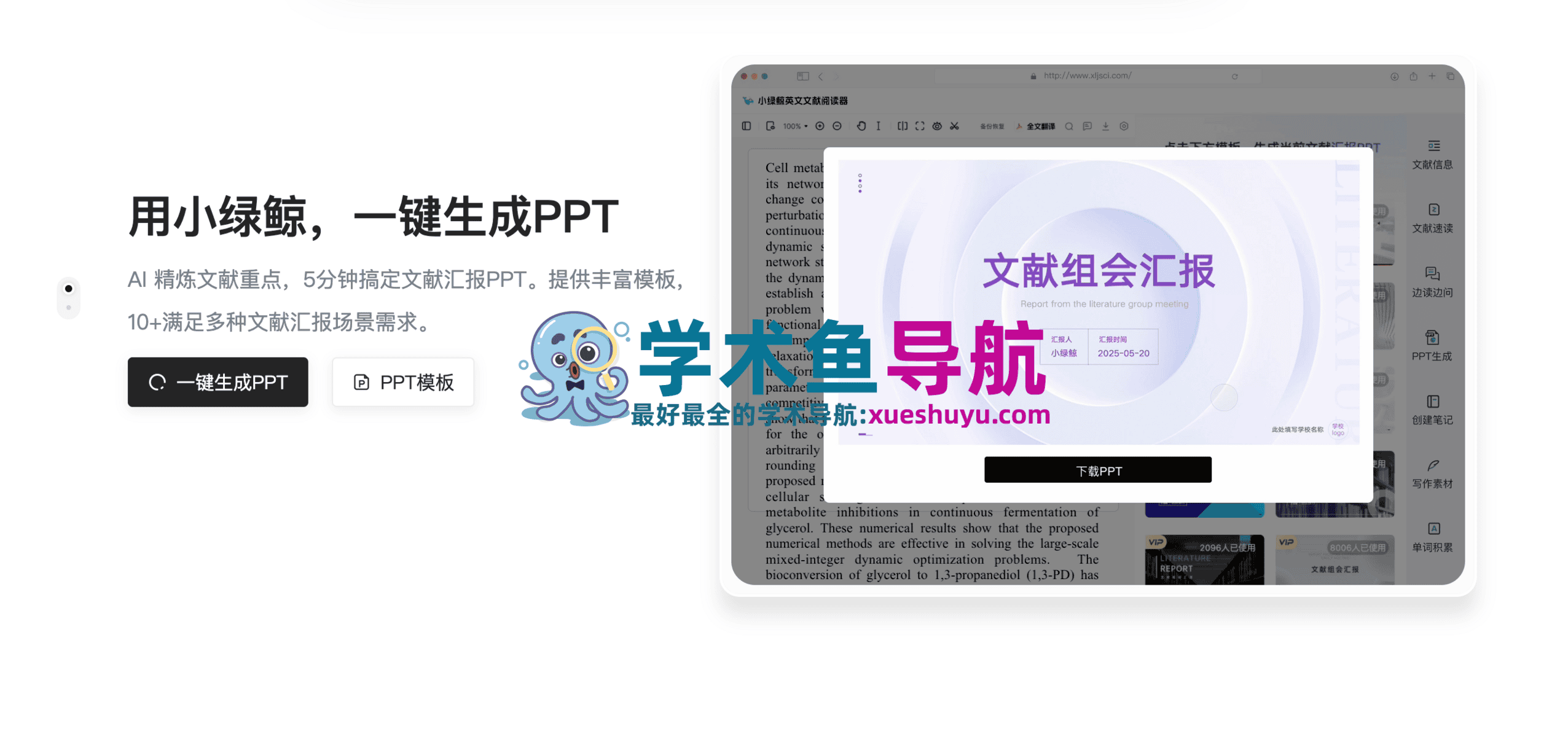 小绿鲸是一款集翻译、笔记、文献管理、文献汇报、写作功能于一体的云端英文文献阅读器。